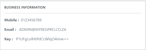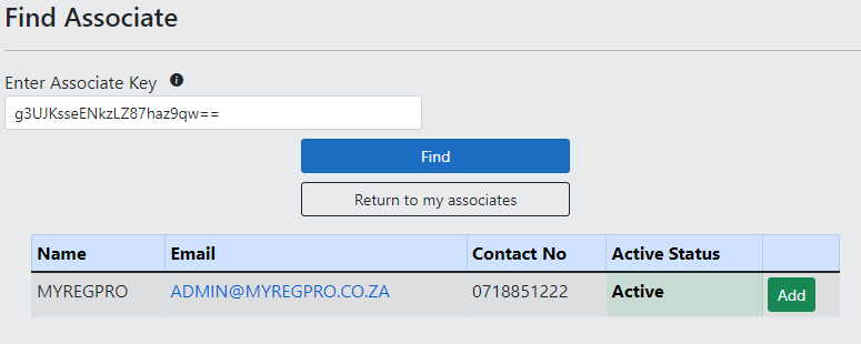 Before you can transfer transaction and have associates for your business, the associate must be registered and also be using MYREGPRO. In order for you to add an associate you will need their company key - this will be automatically generated by the system, you just need to ask them for it.
