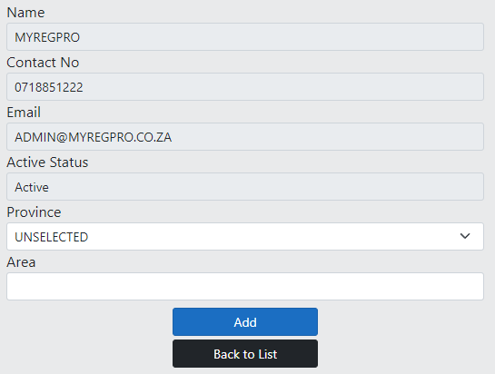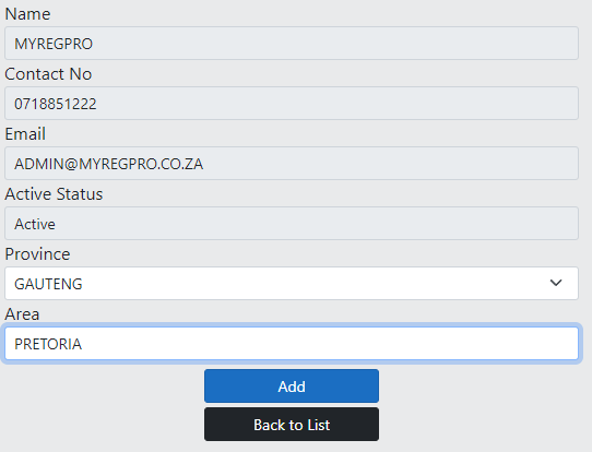 If the key is correct, you should see a table appear with your associates details. Select the "Add" button. You will be navigated to the "Add Associate" page. Here you will see 2 editable field namely "Province" and "Area".