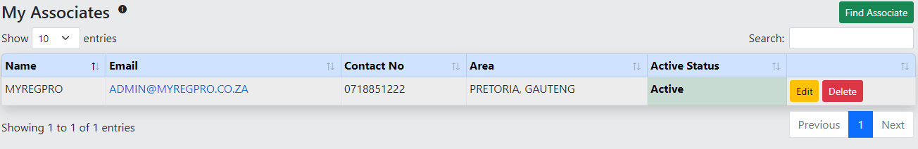 This page also allows you to Edit your associate, to change their active status and/or area and province. You can also delete any associates you no longer wish to have linked to your business.