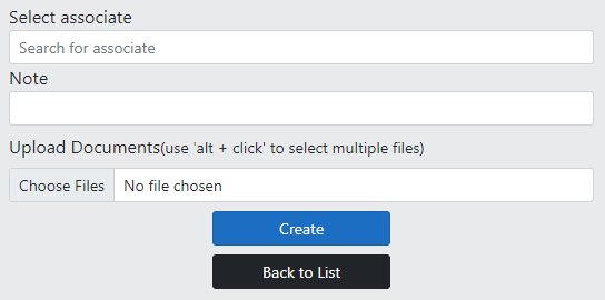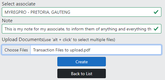 Here you will need to to search and select your associate that you have pre-added. Add a note for you associate, informing them of any details and information they may need. As well as uploading all the necessary documentation for them to process the work. Once done. Hit the "Create Button".